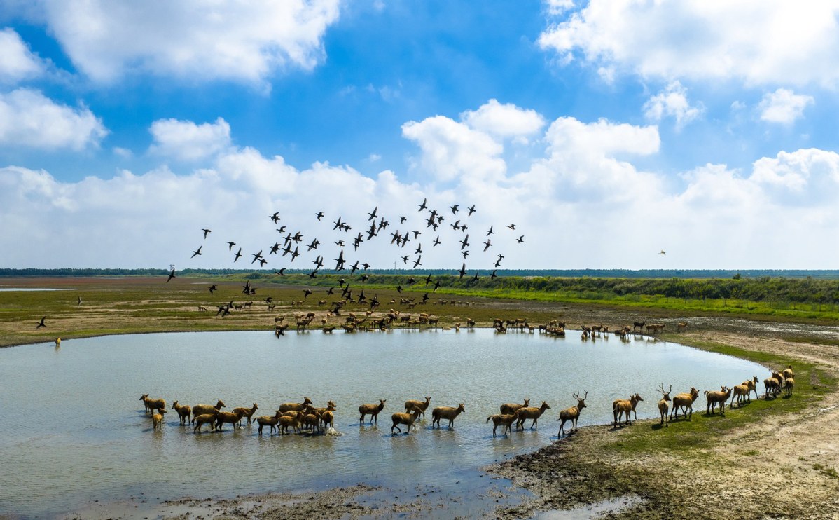2025年10月11日,江苏东台条子泥湿地,候鸟展翅飞翔,成群的野麋鹿悠闲漫步,营造出人与自然和谐相处的生态美景(无人机照片)。图片来源:新华社