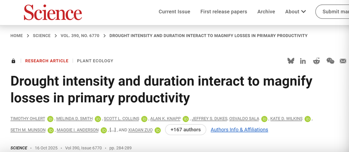 近日,在北京林业大学建校73周年之际,该校于强教授团队联合来自全球28个国家126个机构的177名研究人员的最新研究成果以《干旱强度与持续时间的相关性加剧初级生产力损失》为题发表在Science上。这是学校成立以来第一篇官方科学论文。研究发现,随着干旱强度和持续时间的增加,草地和灌木丛生态系统从逐渐适应转变为生产力迅速下降。